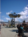 We then decided to take a walk on the playa and wandered around, checking out the bizarre, ever-changing, and mind-numbing atmosphere created by all the fires, the lights, the lasers, the people moving around in weird costumes, etc. We made a full circle back to Bianca's where we ran into Morgan and Ned again and at this point, tired as we were, we lay on the couches. As dawn approached, we slowly started making our way back to camp. The art from the previous night was being moved out and the scenery had changed, making it hard to discern where we were. We ran into a lady (wearing an Indian sari) who started chatting with us from behind. She kept moving around between my left and right which was definitely trippy. I asked her if she was to my right or my left and she responded with "I'm everywhere and nowhere." Truly a bizarre experience (it was as though my ego and sense of place had died---the concept of self and the physical location I was at seemed capable of attaining any arbitrary value).