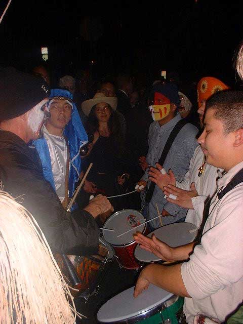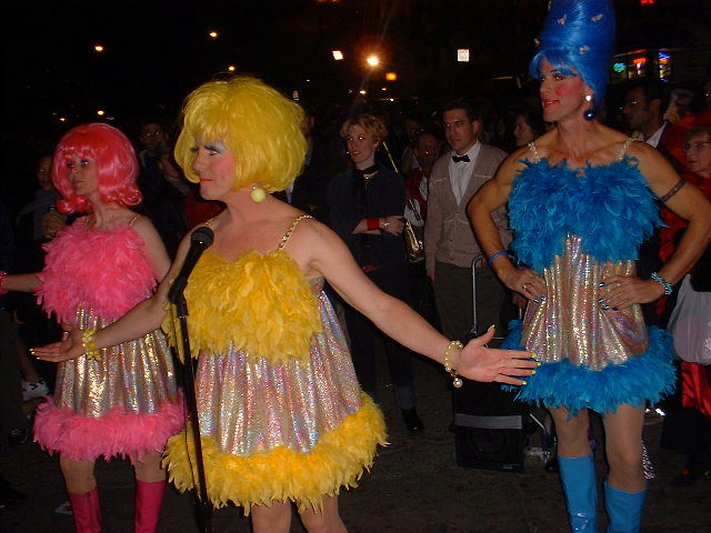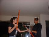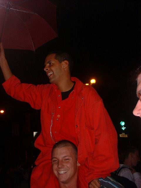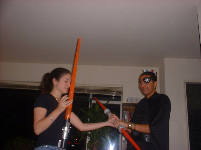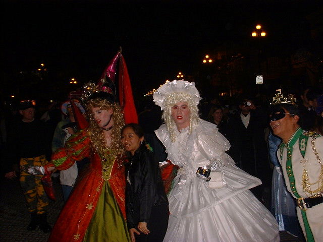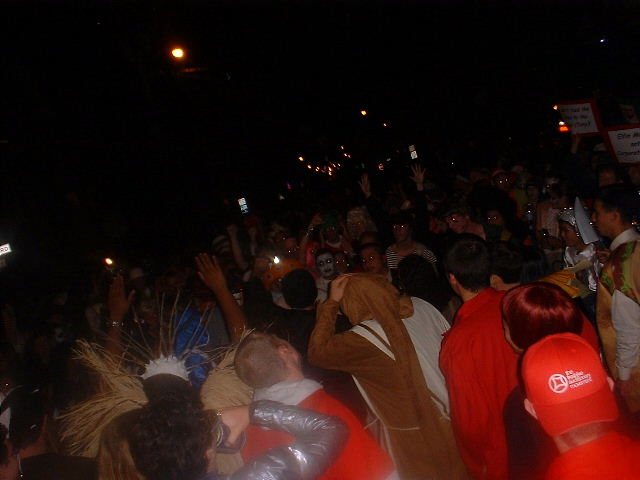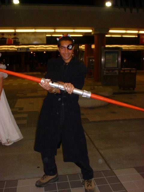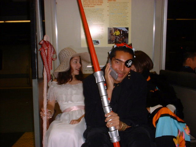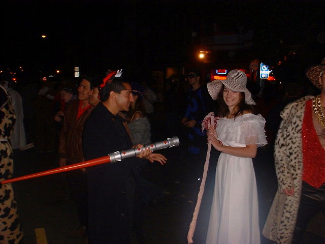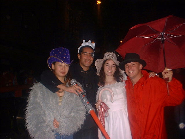 Diverse, crazy, simply marvellous, brilliant, and inspired costumes. Great atmosphere. At times so crowded that everyone was packed as tightly as sardines against each other and the whole crowd moved together as one (very cool). I wanted to go as some combination of Darth Maul, pirate, and a drag queen (aka "Darth pirate queen" though the drag queen part didn't come off as planned, but people did guess the "Darth pirate" part surprisingly well). Dark force light sabre being shattered by Charis aka Little Bo Beep. People being scared by Jason (aka the Red Queen) waving his red umbrella and I with my light sabre (these people didn't belong there). Competing break dancing dancing upstaged by random people from the crowd who could really breakdance. Losing friends and finding them again. I'll let the pictures do the rest of the talking (photos courtesy of Jason).