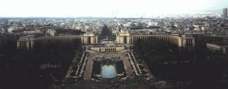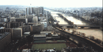 As I walked, I could see the Eiffel tower get closer and closer. Soon enough, I was under the largest flagpole in the world (at 300 metres, the Eiffel tower was built in 1889 as a centrepiece to the World's Fair). After running into a Stanford undergrad, I climbed up the stairs to the second floor and took a picture from all sides---I consider the view of the Palais de Chaillot to be the best, though the views from other three sides were pretty cool as well, particularly the ones of the Seine: . On my way up to the third floor, standing in a long line, I met an ex-Stanford graduate student and we had a long conversation which involved tossing around lateral thinking questions to each other. We stayed through sunset to see Paris at night, which was a beautiful sight but unfortunately my dinky camera didn't capture it.