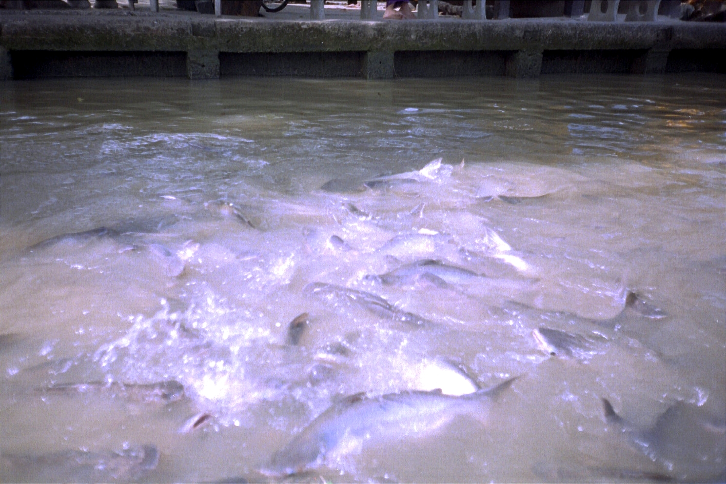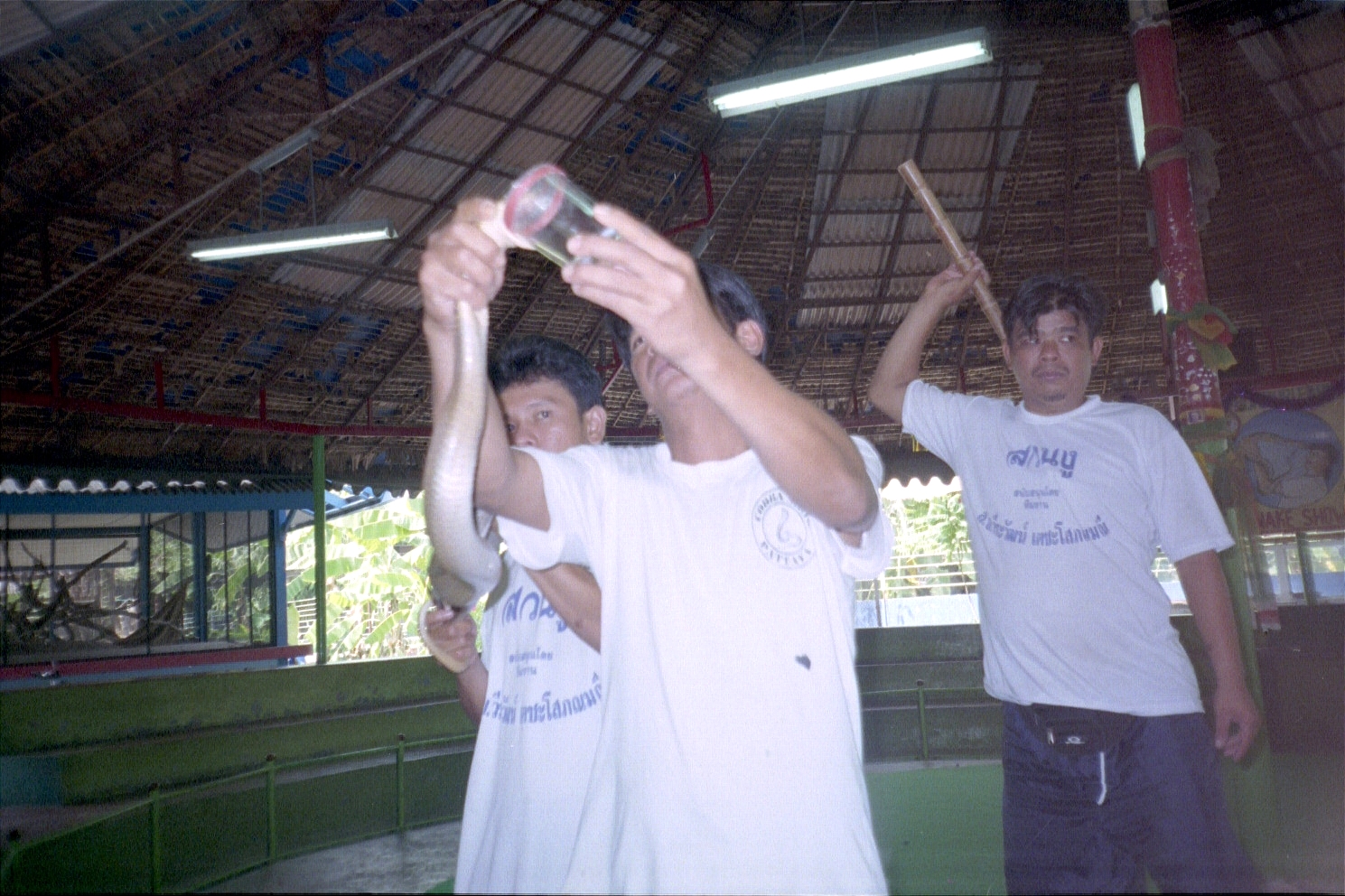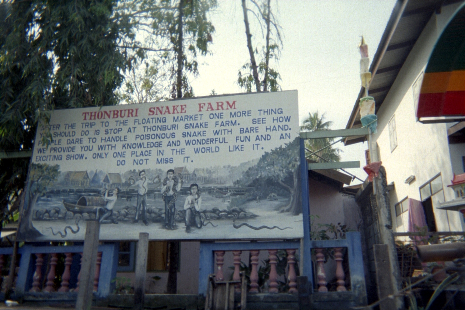 We slept a few hours and started getting lost in the streets of Bangkok. We had breakfast at the Tuptim guest house and I bought some jackfruit (Artocarpus heterophyllus, indigenous to the rain forests of the Western Ghats of India), which I hadn't had in more than ten years. We took a Tuk Tuk (a three-wheeled public transport vehicle, also called an Auto Rickshaw in India and Nepal) to the river and then took a longtail boat (reua hang yao) and rode on it along the Chao Phraya River. Along the way we saw various temples (or Wats), a fish farm where the fish went crazy when bread was tossed, and stopped at the Thonburi Snake Farm.