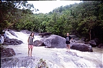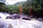 December 15. Ko Phangan is an incredibly relaxing place. The next morning, it was raining heavily and so we slept in, had a late breakfast, and again just mellowed out. Eventually by late afternoon we got a bit antsy and decided to hike to a nearby waterfall. We got there and had to cross the fall to hike higher. After playing around a bit (that's Mali laughing at P'Ram being wary of crossing), we slowly started to cross when Mali (who was ahead of us) suddenly disappeared from view, crashing down at least two levels of the waterfall. Fortunately she went down in a way that didn't cause her too much damage and when I finally went to where she was, she was stunned but okay with a few bruises.