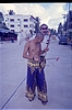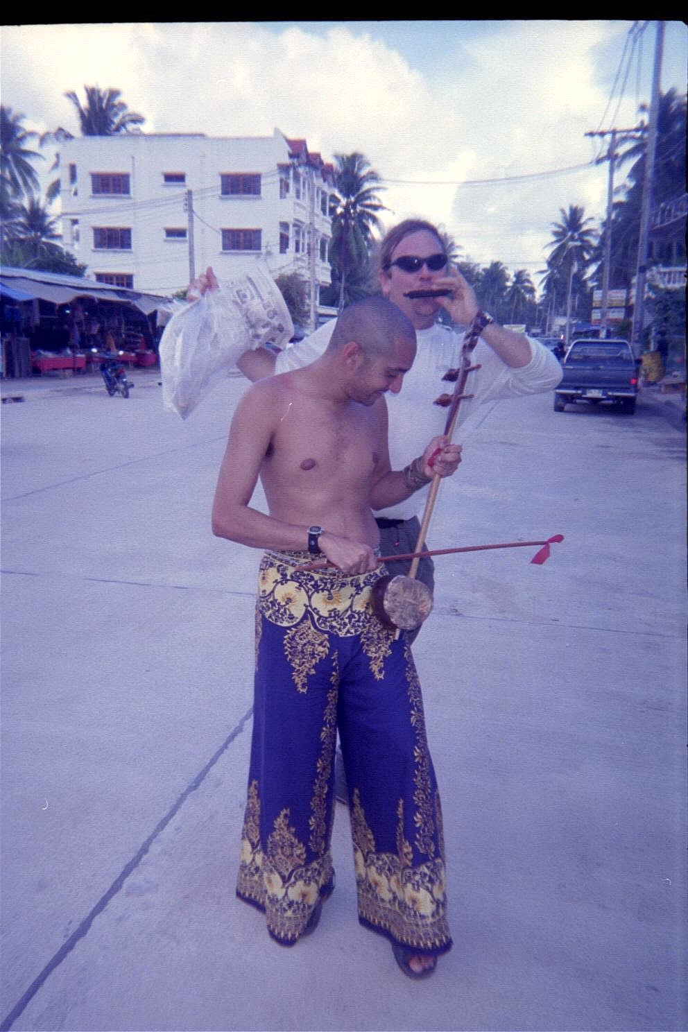 I got a pair of cool Thai-style pants here, which are cut on the sides and the front (or the back) has to be folded up and tied around your waist, as in a sarong. This went very well with my shaved head and some random musical instruments I picked up: